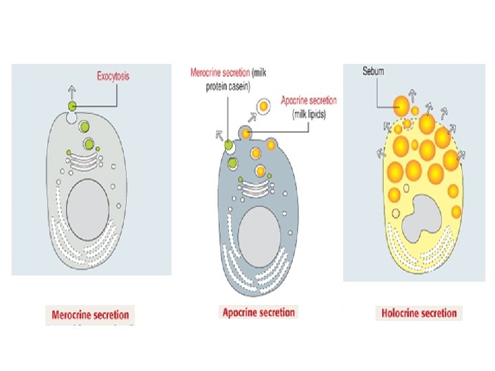 3 -According to the mode of secretion (mechanism) • a-Merocrine glands (no loss of its cellular material) pancreas (exocytosis) • b-Holocrine glands (complete destruction of the cell)---sebaceous gland • c- Apocrine glands ( secretory product is discharged with apical parts of the cytoplasm) ----mammary glands