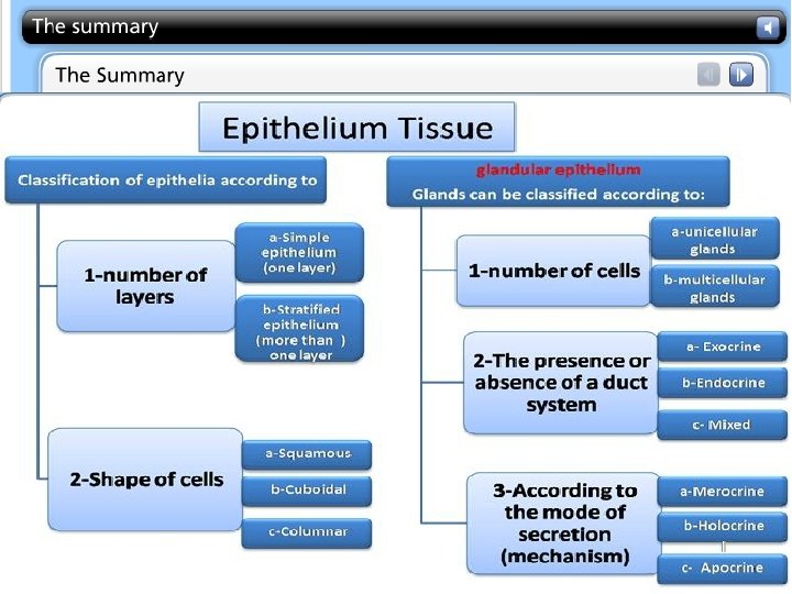 II-glandular epithelium Glands can be classified according to: 1 -number of cells 2 -The presence or absence of a duct system 3 -According to the mode of secretion (mechanism)