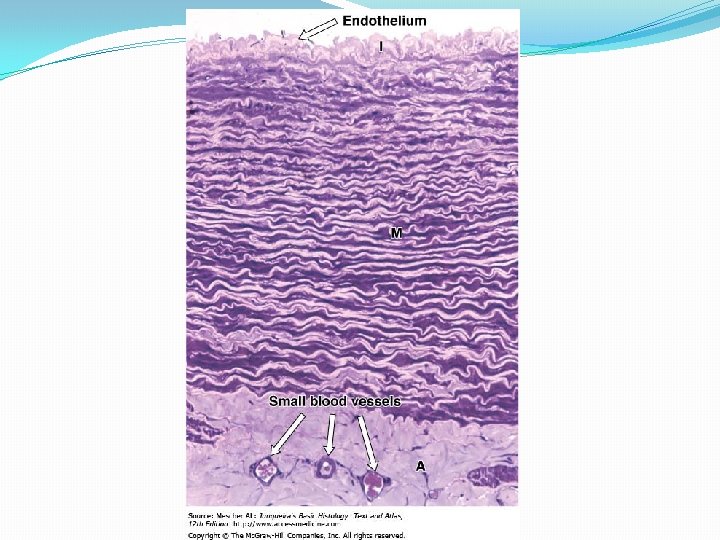LARGE ELASTIC ARTERIES �T. INTIMA �Intima is thicker; smooth muscles in sub endothelial connective tissue �Internal elastic lamina, though present not prominent �T. MEDIA �Concentric lamellae of elastic fibers (40 -70) �Reticular fibers, smooth muscles �T. ADVENTITIA �Less developed