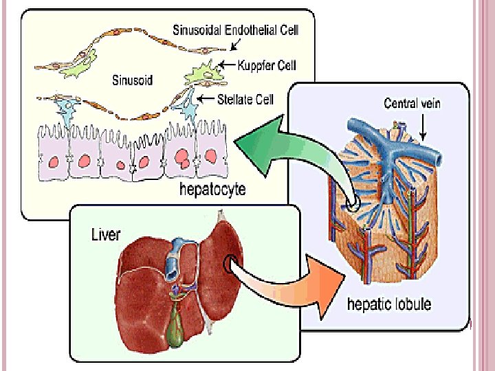 HEPATIC SINUSOIDS Dilated veins with INCOMPLETE basement membrane Supported by reticular fibers Cells: Endothelial cells- fenestrated without diaphragm Kupffer cells (macrophages) present within sinosuoids Metabolize aged erythrocytes, Secrete proteins Digest bacteria