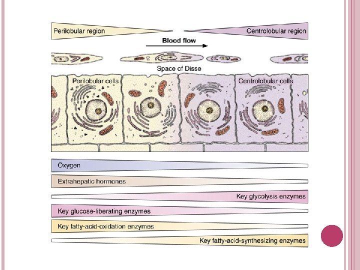 BLOOD SUPPLY Portal vein-70% Portal venule- to portal space Distributing venules-around periphery of lobule into sinosoids Central or centrolobular vein Hepatic artery -30% Arterioles –lead to sinosoids Direction of blood flow- from periphery to center of lobule Difference in properties & functions of peripheral & centrolobular hepatocytes