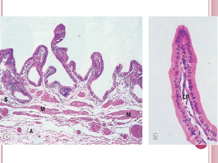 GALL BLADDER Parts Three layers MUCOSA Epithelium- simple columnar Striated border Lamina propria has collagen fibers, muscle fibers, BV, tubuloacinar glands