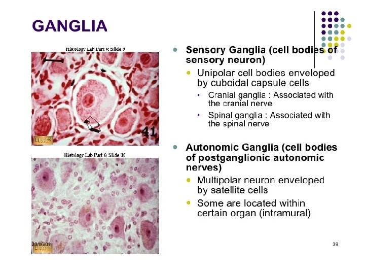 Spinal Ganglia • Sympathetic Ganglia Cell bodies Lie on posterior Nerve Root of Spinal Cord. • Have Sensory Neurons (Unipolar). • Seen Closely • Multipolar Type: Hence Many Dendrites Hence Widely Apart.