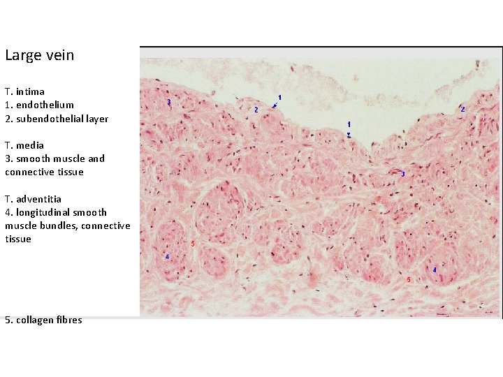 Large vein T. intima 1. endothelium 2. subendothelial layer T. media 3. smooth muscle and connective tissue T. adventitia 4. longitudinal smooth muscle bundles, connective tissue 5. collagen fibres