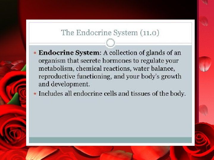 Endocrine system is the system that regulates the tissue activities by a secretory product (hormone) Hormones are chemicals that are released ( from an endocrine cell ) in a small amount , directly to the blood or tissue fluids. They usually act on special cells that are called Target cells.