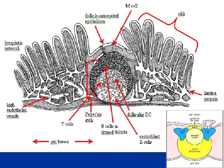 B) Immune cells n Lymphocytes n n In addition to the organized lymphoid tissue in which induction of immune responses occurs within the mucosal immune system, small foci of lymphocytes and plasma cells are scattered widely throughout the lamina propria of the gut wall. These represent the effector cells of the gut mucosal immune system. M (Microfold) cells: n n Site: they are specialized epithelial cells in the epithelium overlying the Peyer's patches. They are much less prominent than the absorptive gut epithelial cells (enterocytes). Shape and structure: they have microfolds on their luminal surface, instead of the microvilli present on the absorptive epithelial cells of the intestine. M cells lack a thick surface glycocalyx and do not secrete mucus. Hence they are adapted to interact directly with molecules and particles within the lumen of the gut.
