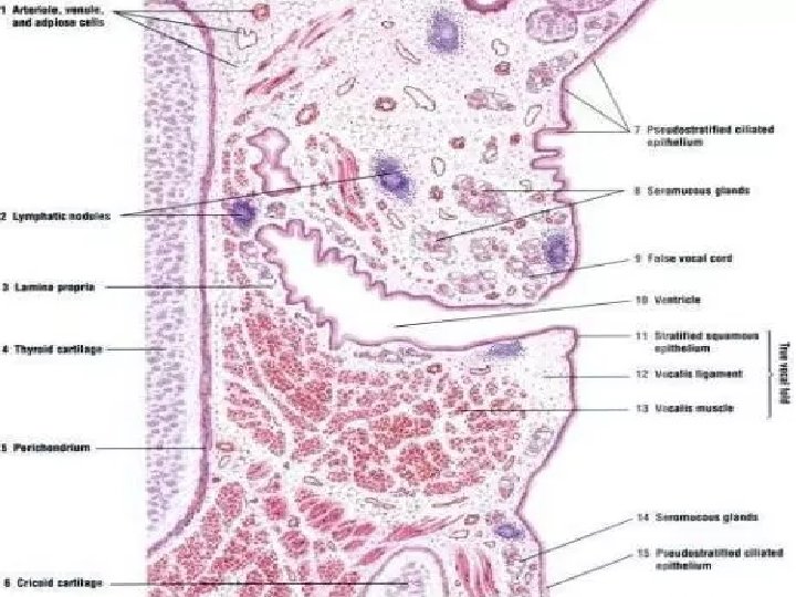 Larynx The larynx and false vocal fold is lined by pseudostratified columnar epith with ciliae and goblet cells (respiratory epith) The true vocal folds are lined by stratified squamous epithelium and contain the muscle (striated) and ligaments. The larynx is supported by a set of complexly shaped cartilages Lamina Propia Contains mixed glands (mostly mucus) with excretory ducts from glands, open on surface of the epithelium. lymphatic nodules can be seen on the ventricular side Underneath the mucosa, cartilages can be seen