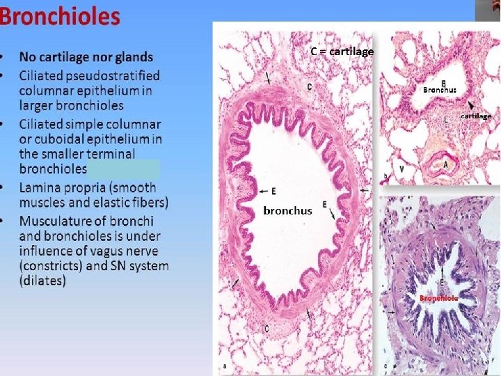 Bronchi Conductive structures of a size down to ~1 mm are termed bronchi. Smaller ones are called bronchioles. Aside from their different sizes, bronchi are characterized by the presence of glands and supporting cartilage. The histological structure of the epithelium and the underlying connective tissue of the bronchi corresponds largely to that of the trachea and the main bronchi. In addition, bronchi are surrounded by a layer of smooth muscle, which is located within the lamina propria. The submucosa Contains muco-serous glands (submucosal glands), The Hyaline cartilage supporting the bronchi is typically found in several small pieces. The cartilage is surrounded by adventitia