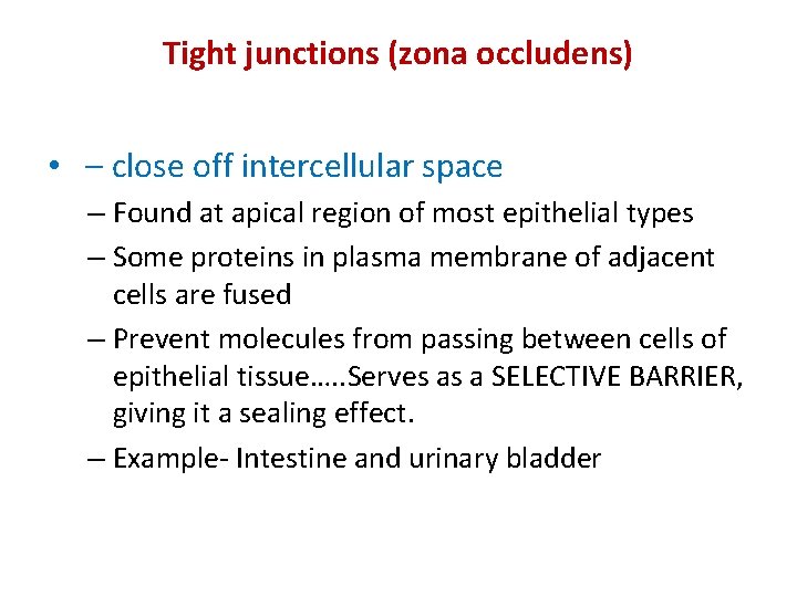 Tight junctions (zona occludens) • – close off intercellular space – Found at apical region of most epithelial types – Some proteins in plasma membrane of adjacent cells are fused – Prevent molecules from passing between cells of epithelial tissue…. . Serves as a SELECTIVE BARRIER, giving it a sealing effect. – Example- Intestine and urinary bladder