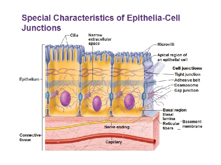 Special Characteristics of Epithelia • Polarity – epithelial tissues always have an apical and basal surface • Support by connective tissue – at the basal surface, both the epithelial tissue and the connective tissue contribute to the basement membrane • Avascular. . No blood vessel, no lymphatics – nutrients must diffuse