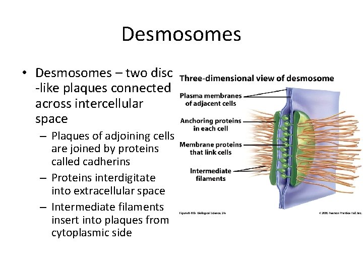 Desmosomes • Desmosomes – two disc -like plaques connected across intercellular space – Plaques of adjoining cells are joined by proteins called cadherins – Proteins interdigitate into extracellular space – Intermediate filaments insert into plaques from cytoplasmic side