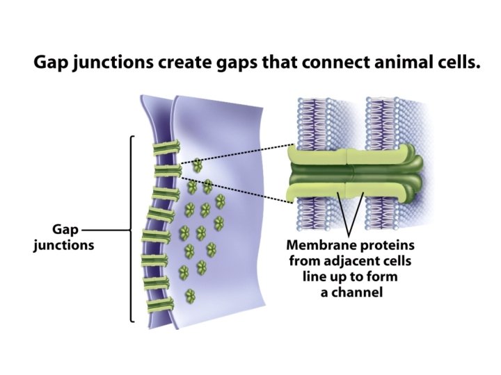 Gap junctions (Nexus) • passageway between two adjacent cells – Let small molecules move directly between neighboring cells – Cells are connected by hollow cylinders of protein – Passage of inorganic ions – Exchange of chemical messengers in cell recognition and differentiation.