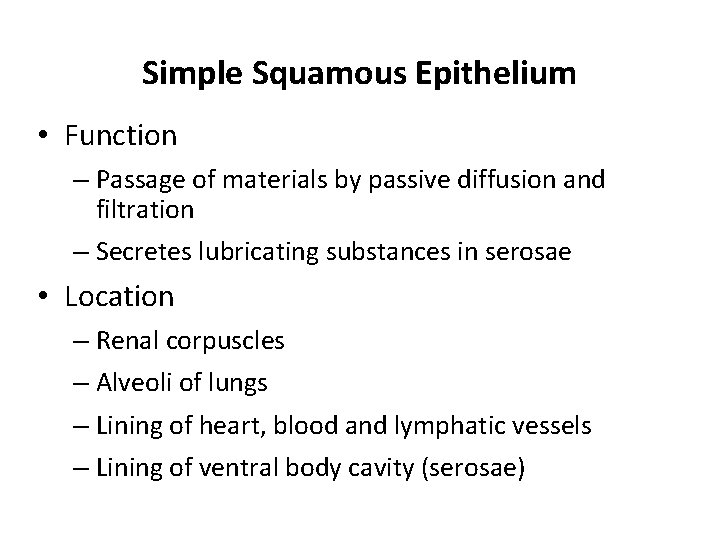 Simple Squamous Epithelium • Function – Passage of materials by passive diffusion and filtration – Secretes lubricating substances in serosae • Location – Renal corpuscles – Alveoli of lungs – Lining of heart, blood and lymphatic vessels – Lining of ventral body cavity (serosae)