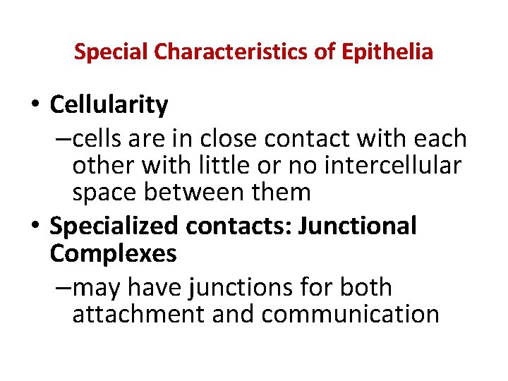 Special Characteristics of Epithelia • Cellularity –cells are in close contact with each other with little or no intercellular space between them • Specialized contacts: Junctional Complexes –may have junctions for both attachment and communication