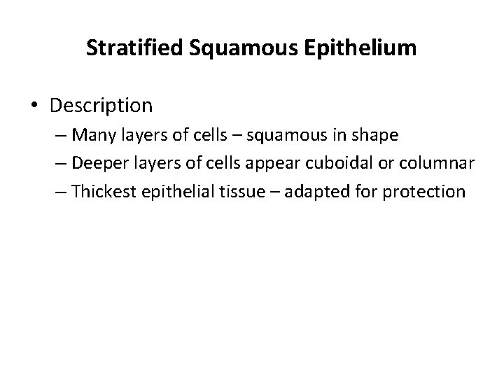 Stratified Squamous Epithelium • Description – Many layers of cells – squamous in shape – Deeper layers of cells appear cuboidal or columnar – Thickest epithelial tissue – adapted for protection