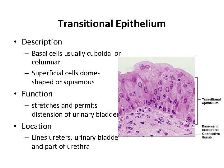 Transitional Epithelium • Description – Basal cells usually cuboidal or columnar – Superficial cells domeshaped or squamous • Function – stretches and permits distension of urinary bladder • Location – Lines ureters, urinary bladder and part of urethra