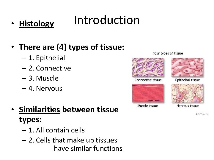 • Histology Introduction • There are (4) types of tissue: – 1. Epithelial – 2. Connective – 3. Muscle – 4. Nervous • Similarities between tissue types: – 1. All contain cells – 2. Cells that make up tissues have similar functions