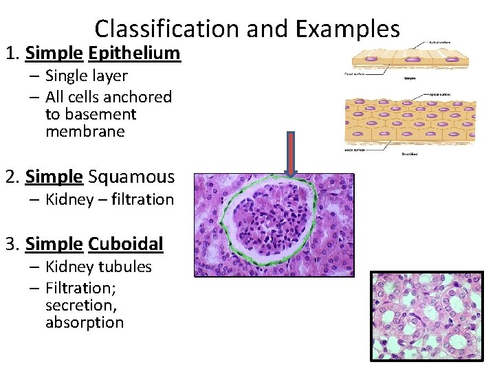 Classification and Examples 1. Simple Epithelium – Single layer – All cells anchored to basement membrane 2. Simple Squamous – Kidney – filtration 3. Simple Cuboidal – Kidney tubules – Filtration; secretion, absorption
