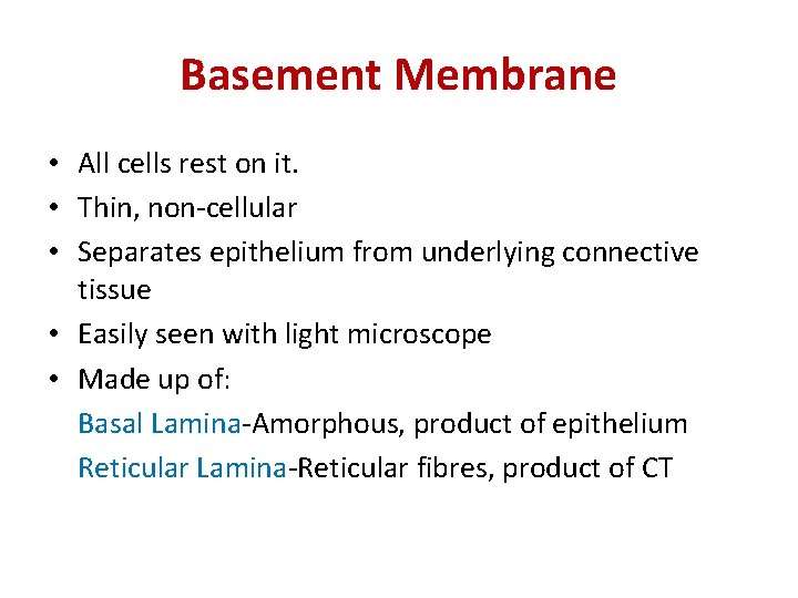 Basement Membrane • All cells rest on it. • Thin, non-cellular • Separates epithelium from underlying connective tissue • Easily seen with light microscope • Made up of: Basal Lamina-Amorphous, product of epithelium Reticular Lamina-Reticular fibres, product of CT