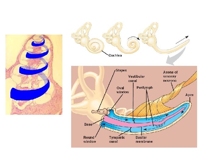 Čulo sluha - kohlein kanal – koštani deo - kohleina cev – membranski deo - modiolus (koštana osovina sa spiralnom ganglijom) - scala vestibuli (ispunjena perilimfom) - scala media (kohleina cev; ispunjena endolimfom) - scala tympani (ispunjena perilimfom) - scala vestibuli i scala tympani komuniciraju preko otvora koji se zove helikotrema