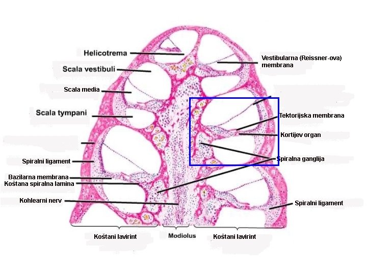 sc. vestibuli m o d i o l u s Rajsnerova “membrana” tektorijska “membrana” str. vascularis sc. media sp. limbus Kortijev organ spiralna ganglija koštana spir. lamela bazilarna “membrana” sc. tympani sp. ligament