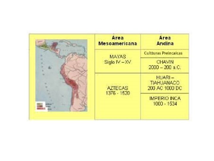 Área Andina Culturas Pre incaicas Hacia 3500 a. C. Domesticación de plantas como papa, quinoa y calabaza. Domesticación de animales como llama. 3500 a 1800 a. C poblados, agricultura y jefaturas. -desde 1200 a. C. Ayllu – Archipiélago