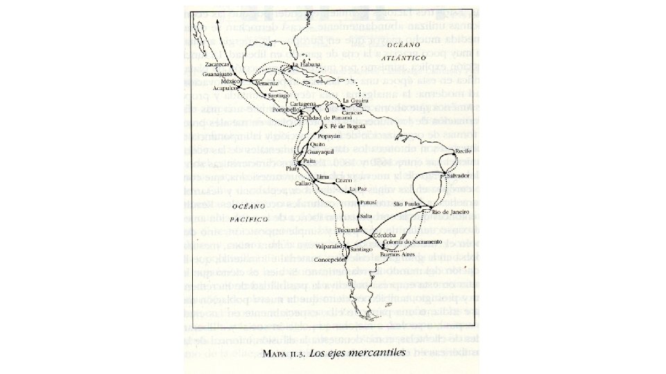 Ruggiero Romano, “Problemas del comercio en Hispanoamérica”, 1989. • Qué sucede en un puerto como Buenos Aires • Entre 1648 y 1702 llegan 34 barcos “oficiales” • Estimación de unas 100 toneladas de mercancías para aprovisionar hasta Alto Perú • Pero además hubo unos 124 “arribadas maliciosas”de barcos extranjeros y españoles: 78. 89 % - 21. 11% • • • Holandeses 50% Portugueses 24% Franceses 7% Españoles 13% Ingleses 9%