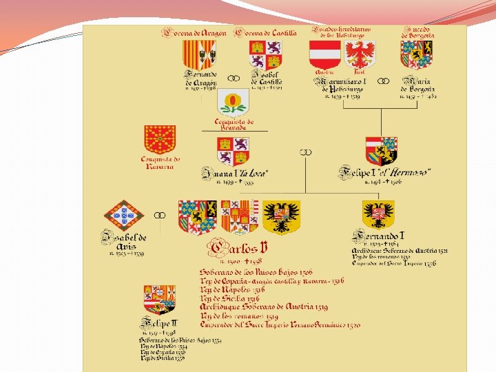 Herencia de Fernando & Isabel Hija: Juana ( “la loca”) Se casa con Felipe “ el hermoso” de Alemania (casa de Austria. ) Su hijo, Carlos I, hereda los tronos de España 1516 -1556 y otros reinos Habsburgos. También es emperador del Sacro Imperio Romano (1519)como Carlos V de Alemania. Es conocido como Carlos I (primero) Y V (quinto) de Alemania.