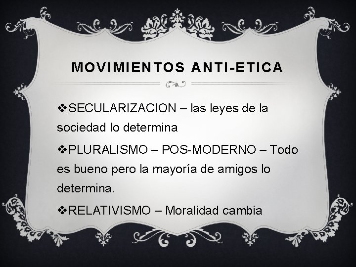 MOVIMIENTOS ANTI-ETICA v. SECULARIZACION – las leyes de la sociedad lo determina v. PLURALISMO – POS-MODERNO – Todo es bueno pero la mayoría de amigos lo determina. v. RELATIVISMO – Moralidad cambia