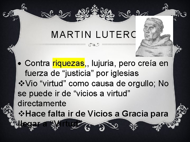 MARTIN LUTERO Contra riquezas, , lujuria, pero creía en fuerza de “justicia” por iglesias v. Vio “virtud” como causa de orgullo; No se puede ir de “vicios a virtud” directamente v. Hace falta ir de Vicios a Gracia para llegar a “Virtud”