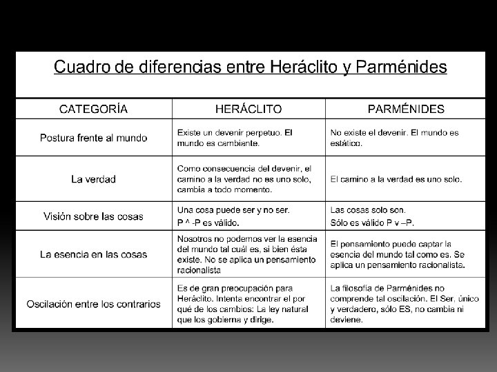 2. 3. HERÁCLITO -500 a. C. El mundo: Toda la realidad está en constante devenir y cambio que tienen su origen en la lucha de contrarios. Todo está regido por un principio. Este principio va a ser el "logos" o razón, la inteligencia, lo "sabio". El logos se identifica con el fuego, "con el eterno y viviente fuego". El fuego-logos- es el arjé de todas las cosas “ Nunca nos bañamos dos veces en el mismo río ".