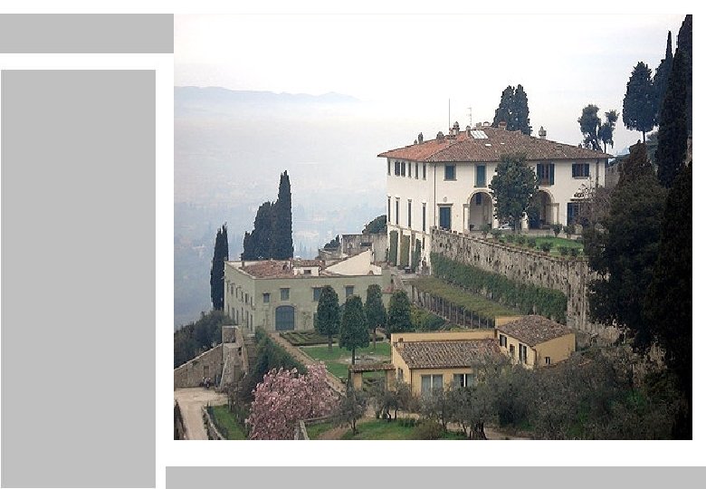 Ubicación -Ubicación · contexto geográfico · Emplazamiento actual -Información técnica de la obra · Datos Generales -Concepto · Identificación · Desarrollo -Cuerpo elemental · Presentación · Elementos geoculturales · Obra y su representación planimétrica -Cuerpo geométrico · Formación · Estudio y análisis -Caso en Santiago · Lugar elegido · Análisis de Proporción con respecto a la obra Se ubica en Fiesole, ciudad de la provincia de Florencia, en la Toscana, Italia. Se encuentra a 8 km de Florencia en una montaña (346 m) desde la que se ve una fantástica panorámica de Florencia y donde esta ubicada la mayoría de sus villas (actualmente hoteles de Fiesole)