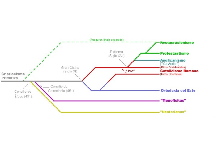 Iglesia Moderna Desde el fin de la guerra de los treinta años (1648 d. C) Hasta la actualidad • • La iglesia Católica Romana ha seguido su propio camino, aparte por completo del mundo protestante. Del movimiento puritano surgieron las iglesias presbiteriana, congregacionalista y bautista. Del movimiento wesleyano surge la iglesia metodista. El movimiento racionalista permitió que el contenido de la Biblia y las doctrinas del cristianismo se estudiasen ampliamente y se entendieran con mas inteligencia. Movimiento anglocatólico; movimiento misionero moderno. Explosión del surgimiento de denominaciones protestantes. Iglesia Protestante Episcopal, Iglesias Congregacionales, Iglesias Reformadas, Iglesias Bautistas, Iglesia Luterana, Iglesia Presbiteriana, Iglesia Metodista, Iglesia Discípulos de Cristo, Iglesia Pentecostal, etc. Surgimiento de sectas no cristianas: Testigos de Jehová (1879), los Mormones (1830), Adventistas (1844), Unitarios (1961), Ciencia Cristiana (1879), Dianética (1954), Nueva Era (1880), etc.