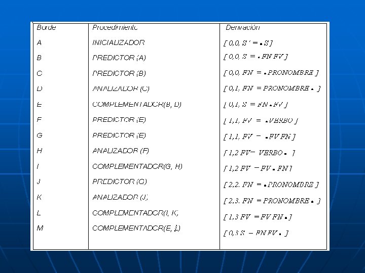 La grafica de una oración formada por n palabras consta de n+1 vértices y varios bordes [ 0, 5, S [ 0, 2, S FN FV ■ ] FN ■ FV
