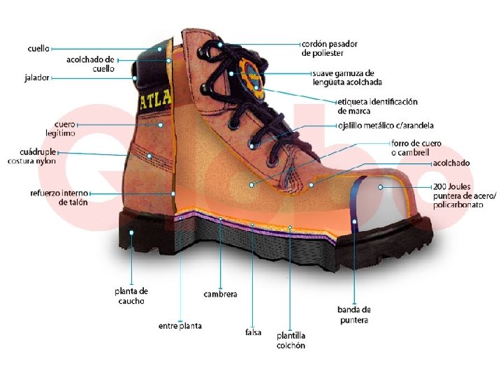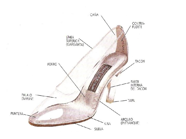 PARTES DE UN ZAPATO Aunque algunos zapatos tengan más elementos que otros (no podemos comparar unas botas a unas chanclas), estas son algunas de las partes que nos encontramos en un zapato común. Suela: es la parte trasera del zapato y es la que hace contacto con el suelo. Plantilla: la plantilla se coloca en el interior del calzado y es lo que separa nuestro pie de la parte inferior del zapato. Protegen la zona interior del zapato y en muchas ocasiones se pueden quitar y reemplazar. La plantilla también ayuda a reducir el impacto del pie contra al suelo cada vez que caminamos, y hoy en día se utiliza incluso en zapatos para mujeres. Tacón: La parte trasera que alza el zapato es el tacón. Su verdadera función es ayudar al talón del pie, pero en las últimas décadas, los zapatos de las mujeres han incrementado la talla del talón por motivos de moda o par aparecer más altas. Si utilizamos tacones de más de 6 centímetros podemos sufrir deformaciones en los dedos de los pies o problemas en la planta de los pies. Empeine: Todos los zapatos cuentan con una parte superior que sirve para sujetar el pie al zapato. En los casos más simples, como en las chanclas o en las sandalias, tan solo se necesitan una o dos tiras. Las zapatillas deportivas cuenta obviamente con mayor material en el empeine. Lateral: La parte lateral que sirve de referencia a la parte del empeine.