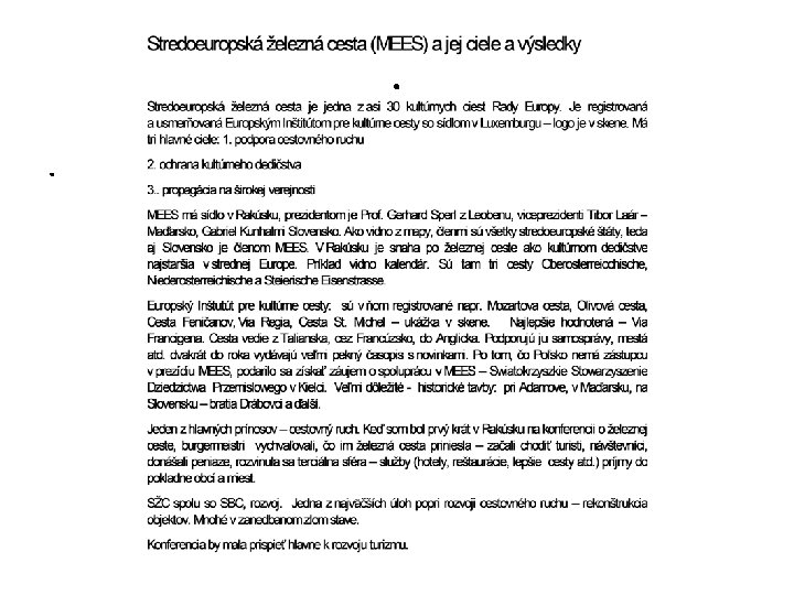 Historické banské cesty v strednej Európe • Historicky lokality Slovenskej banskej cesty a Slovenskej železnej cesty súvisia so širším územím – je to práve minimálne územie krajín dnešnej V 4 • Čo majú tieto lokality spoločné: - nachádzajú sa v pohľadovo zaujímavých prírodných a krajinných scenériách - t. č. majú ešte aspoň čiastočne až výnimočne zachovalú pôvodnú architektúru každého druhu výnimočne zladenú s krajinou (ľudovú, mestskú, sakrálnu, priemyselnú, bansko-technické a vodohospodárske diela, pozostatky dobových dopravných ciest) - po útlme banskej činnosti posledných 25 rokov zvýšenú , resp. v niektorých regiónoch najvyššiu nezamestnanosť, ktorá nebola doposiaľ nahradená žiadnou inou výrobou, nevýrobnou sférou ani iniciatívami cestovného ruchu, resp. turizmu.