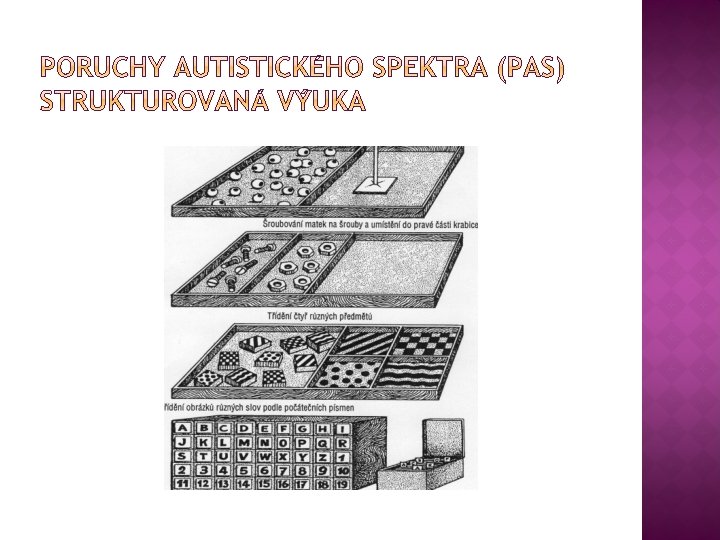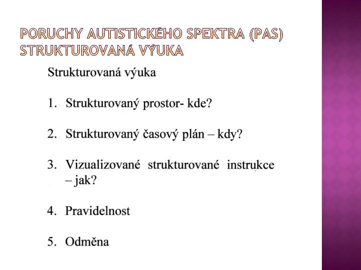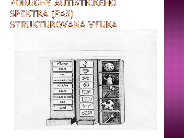 � Autistické děti prosívají nejlépe v strukturovaných podmínkách, vrozený deficit ve zpracování vnějších podnětů a vstupních informací, neschopnost analyzovat situace, třídit informace na podstatné a zbytečné, organizace jakékoliv činnosti, neschopnost řídit svoji práci – důvod proč musíme do těchto činností vnést určitý řád, pravidelnost, dítě musí dostávat jednoznačné odpovědi na otázky kde? kdy? Jak dlouho? , jaký sled činností?