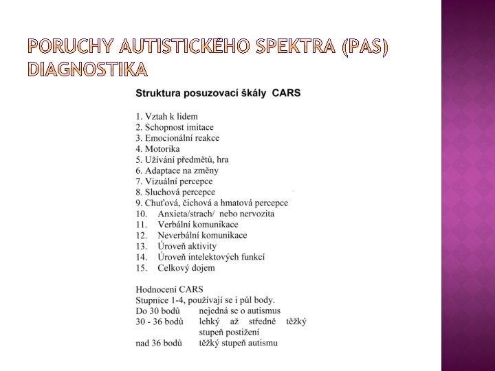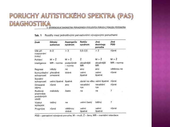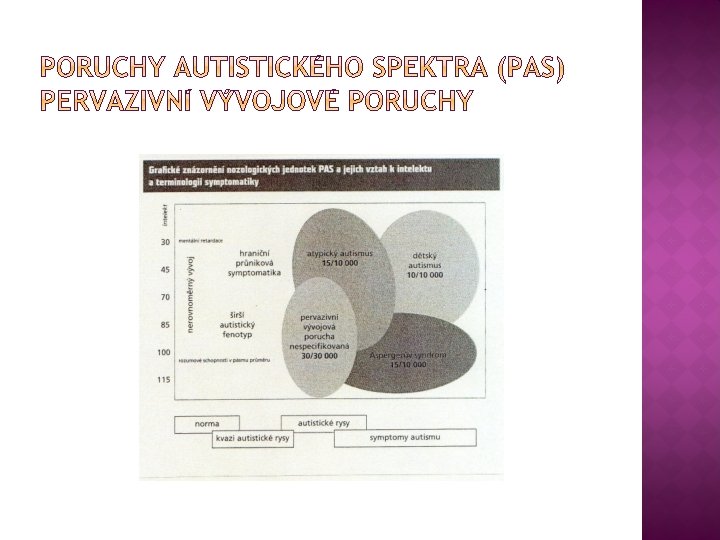 � Atypický autismus – dítě splňuje jen částečně diagnostická kritéria daná pro dětský autismus (autistické rysy), narušený vývoj se stává zřejmý až po dosažení věku tří let, nejsou obvykle naplněny základní znaky autistického chování, atypičnost vzniká nejčastěji u těžké a hluboké mentální retardace. � Aspergerův syndrom – porucha charakterizovaná stejným typem příznaků jako autismus, ale liší se tím, že se nevyskytuje celkové opoždění vývoje, IQ v normě, není opožděný vývoj řeči, problémy v oblasti motoriky, zejména u chlapců 8: 1. Nízko funkční a vysoce funkční Aspergerův syndrom – úroveň adaptability, prognóza vývoje, specifické nadání.
