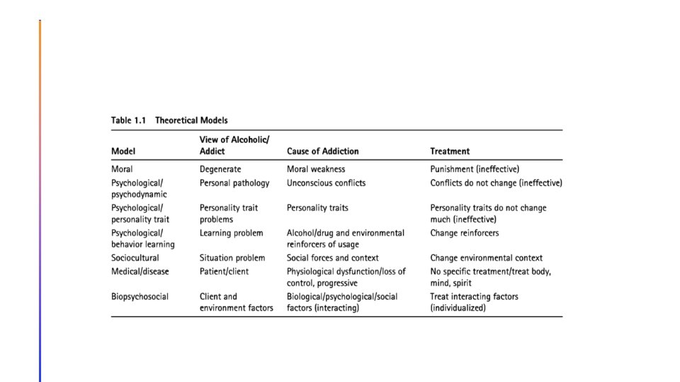 Psychological Models of Substance Use: Psychodynamic Theory • View of Person with addiction: Personal Pathology • Goal of treatment: Uncover unconscious conflicts • Treatment: Work with Conflict (can be ineffective) (Goodman, n. d. ; Johnson, 2013; Zimberg, 1985)