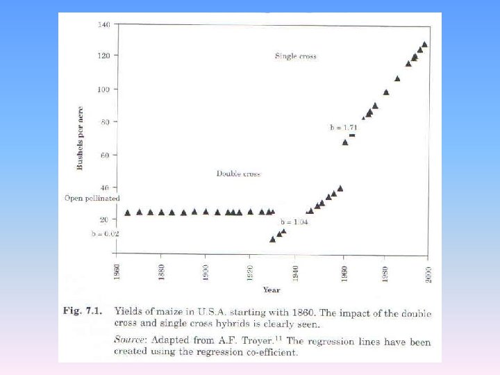 Wheat improvement - Yield barrier • 20 varieties grown over 80 yrs. were analyzed (Kulshrestha and Jain , 1981) -1910 -60 Tall -2 per decade for six deacdes-12 -1970 -80 Dwarf -4 per decade-8 Evaluated for: -grain yield -HI -# effective tillers/sq. m -plant ht. -grain wt -total dry matter Tall var. showed significant differences for 1 st 4 characters but did not show significant difference in biol. yield & grain. Wt K 13 (Kanpur) and NP 165(IARI) showed significant but small improvement in yield 1940 s, 50 s & 60 s no difference in grain yield despite concerted efforts Significant difference recorded in var. of 1970 s & 80 s Indian breeders struggled to break yield barrier over 60 yrs. But did not succeed