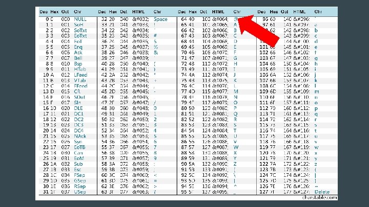 ASCII Coding Uses 7 -bit binary codes Each letter or symbol is assigned decimal number 0 -127 First 32 characters are ‘nonprintable’ Used as commands (i. e. shift, backspace) Remaining characters are ‘printable’