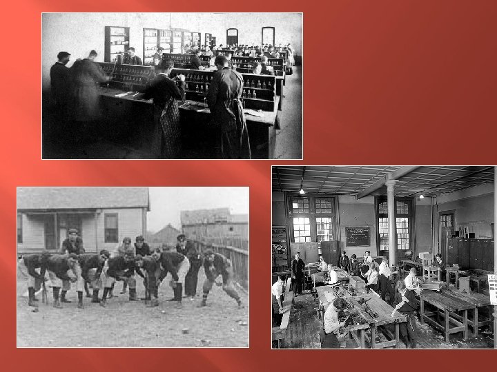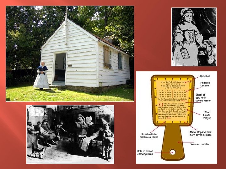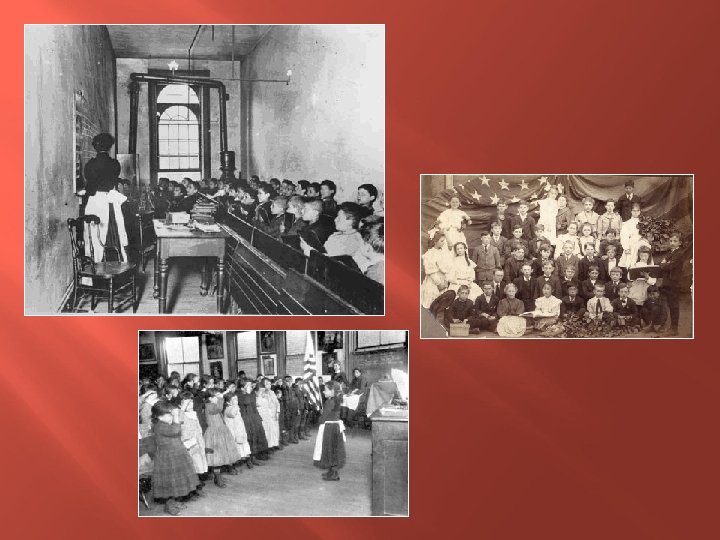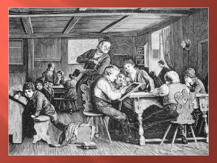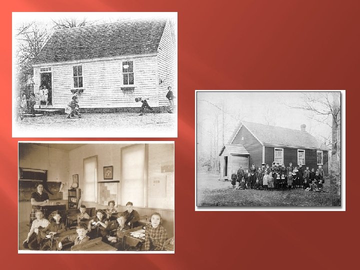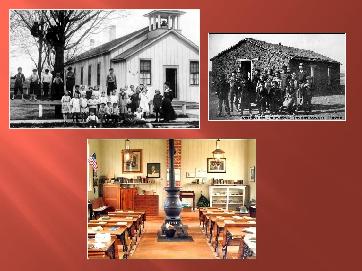 The One Room School Local school board, elected by people, set the tax rate, hire and supervise the teacher. 1 teacher, students from age 5 -17 in one room. Studied reading, writing, grammar, spelling, arithmetic, history, geography, and hygiene. Students memorized and recited information Punctuality, honesty, and hard work were stressed values. Teachers were the janitor, record keeper, and administrator