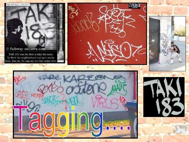 Taki 183: Initiator of Tagging At about the same time as Keith Haring, a delivery messenger began writing "Taki 183" whenever he delivered documents. Soon his name was all over the city. Newspapers and magazines wrote articles about him and Keith Haring. Both became celebrities. This claim to fame attracted many young people, especially those involved with rapping. They began to imitate "Taki 183". Graffiti was part of the Hip Hop culture which also saw the start of rapping and break dancing. Breakdancing has since lost much of its initial popularity, while rapping has emerged as a major style in American music. New York City was inundated with graffiti during the late seventies and early eighties. But as media coverage faded so do did the graffiti. Then in the mid-eighties a national TV program did a graffiti story and set off a graffiti wildfire which really has become world-wide. . That’s the story of today’s graffiti….