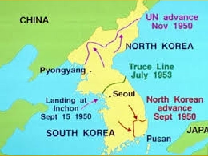 President Truman "Korea is a small country, thousands of miles away. But what is happening there is important to every American. The fact that communist forces have invaded Korea is a warning that there may be similar acts of aggression in other parts of the world. . . " The U. S. led UN forces pushed the North Koreans back to the 38 th parallel and then kept going. They pushed all the way to the border of China…