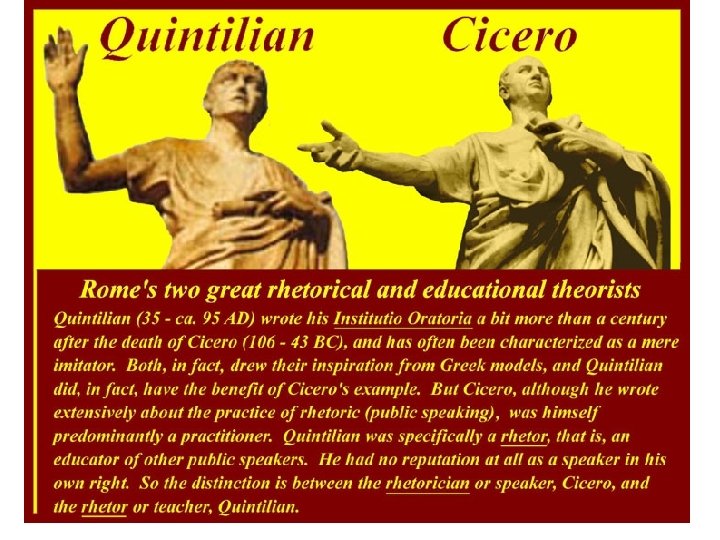 • Cicero wrote several treatises on theory and practice of rhetoric, the most important being On the Orator; Quintilian's famous Institutio Oratoria still retains its value as a thorough treatment of the principles of rhetoric and the nature of ideal eloquence. Scholastic declamations of the early empire are found in the extant suasorioe and controversioe of the rhetorician Seneca, the former belonging to deliberative rhetoric, the latter dealing with legal issues and presenting forensic rhetoric. During the first four centuries of the Roman Empire, rhetoric continued to be taught by teachers who were called Sophists, the term by this time used as an academic title.