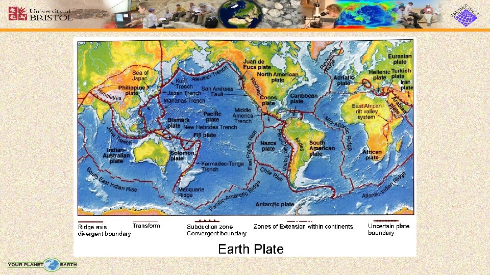 Plate Tectonics Summary • The Earth is made up of 3 main layers (core, mantle, crust) • On the surface of the Earth are tectonic plates that slowly move around the globe • Plates are made of crust and upper mantle (lithosphere) • There are 2 types of plate • There are 3 types of plate boundaries • Volcanoes and Earthquakes are closely linked to the margins of the tectonic plates