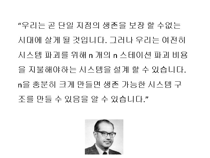 We will soon be living in an era in which we cannot guarantee survivability of any single point. However, we can still design systems in which system destruction requires the enemy to pay the price of destroying n of n stations. If n is made sufficiently large, it can be shown that highly survivable system structures can be built. . . - Paul Baran, On Distributed Communications, Volume I, 1964.