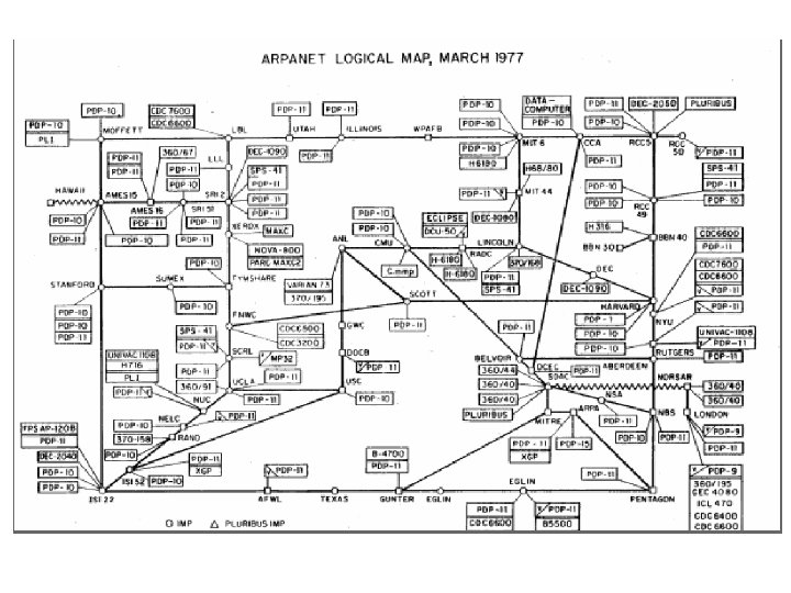 1971 • 15 nodes (23 hosts): UCLA, SRI, UCSB, Univ of Utah, BBN, MIT, RAND, SDC, Harvard, Lincoln Lab, Stanford, UIU(C), CWRU, CMU, NASA/Ames.