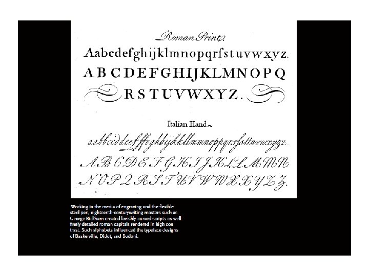 Typefaces have been put into very broad categories – type classification systems. These systems were devised in the nineteenth century to assist printers in identifying type. By doing this it has helped us to recognise typefaces and learn the different functions suited to the various type families. Initially we can divide typefaces into: • text type (what you would typically use in the body of your text) • display type (what you would typically use for headings). Text type can be placed into three broad categories: firstly, Old Style letterforms, which are closely connected to calligraphy and the way our hand naturally moves to create letterform. Then there are Transitional and Modern; these typefaces are less organic and are inspired by original and abstract forms. Display type came about in the nineteenth century because existing fonts were primarily used for books and therefore not always suited for billboards, posters and pamphlets. Bolder, stronger faces were required for this new context; Ultra Bodoni is an example produced in that era that is still used today.
