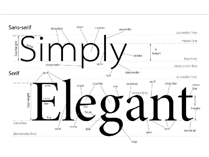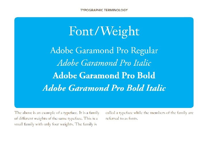 FONT A font is the one size, weight and width of a typeface: for example Arial Narrow 11 pt is a font. Serif and Sans Serif Fonts Serifs are the small tick-like lines at the end of character strokes. Every letter in a serif font includes serifs. The serifs assist the eye to read the text. Typeface is usually mistaken with font. But they are different. A sans serif font doesn’t have serifs and is typically used in headings and titles. The term font refers to a specific member of the typeface family; for example: roman, bold or italic. Type Families Type families are the complete set of one typeface. The roman font is the initial font from which a family of typefaces derives. Every font style has different type families. For example: Typeface refers to the consistent visual appearance or style; for example, Helvetica or Times New Roman. Typefaces can be divided into two main categories: serif and sans serif. Condensed Bold, Condensed Black, Ultra Light Italic, Light, Regular, Roman, Italic, Extended